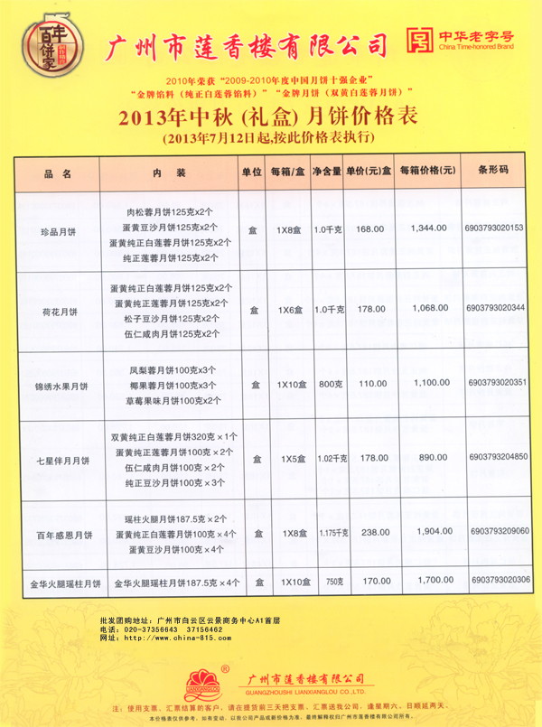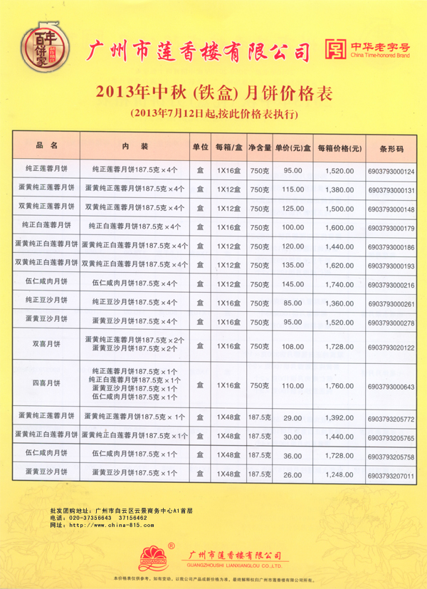 2013莲香楼月饼价格表