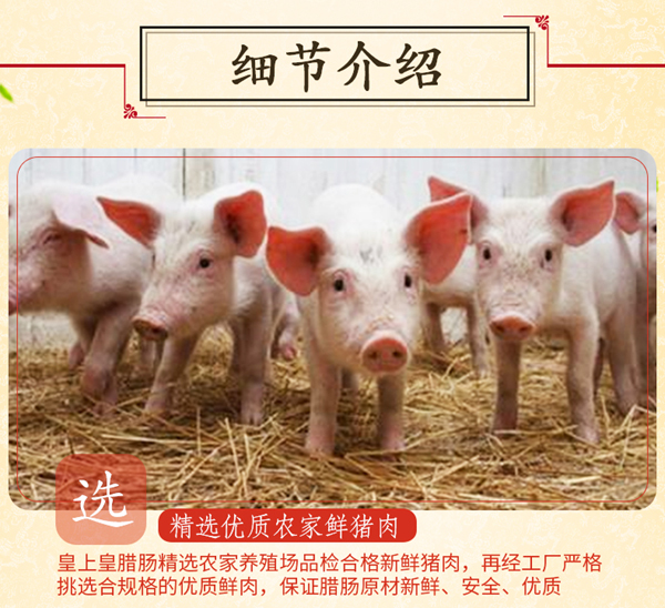 特 色: 采用皇上皇传统腊味制作技艺,精选最佳上好无皮放心上肉,肥瘦比5:5黄金比例,配上山西汾酒、广州老字号致美斋酱油等优质辅料精制而成,富含人体所需的各种氨基酸,肉质鲜嫩可口,营养价值高。具有独特的“豉味”“风味”“香味”,口感醇厚,晶莹通透,香味浓郁。