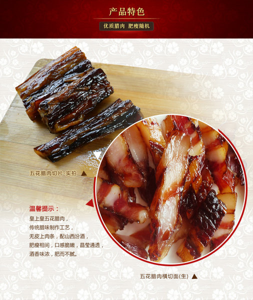 特 色: 采用传统腊味制作工艺,精选最佳上好无皮放心上肉,配上山西汾酒,肥瘦相间,口感脆嫩,晶莹通透,酒香味浓,肥而不腻。