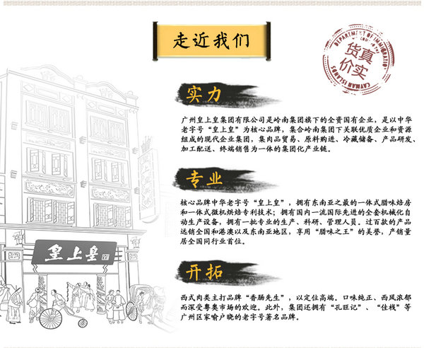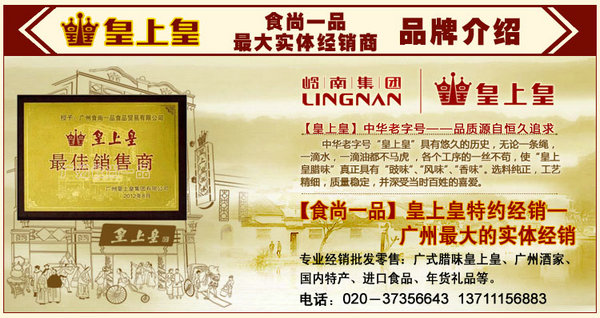 出品商:广州皇上皇集团有限公司是广州岭南国际企业集团有限公司旗下的全资国有企业,是一家集食品加工、冷藏储存、肉品贸易、屠宰加工及鲜肉销售的大型国有企业集团,亚洲最大的腊制品企业,引领着中国腊制品行业发展新方向。