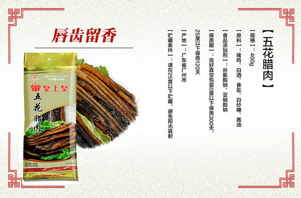 出品商:广州皇上皇集团有限公司是广州岭南国际企业集团有限公司旗下的全资国有企业,是一家集食品加工、冷藏储存、肉品贸易、屠宰加工及鲜肉销售的大型国有企业集团,亚洲最大的腊制品企业,引领着中国腊制品行业发展新方向。