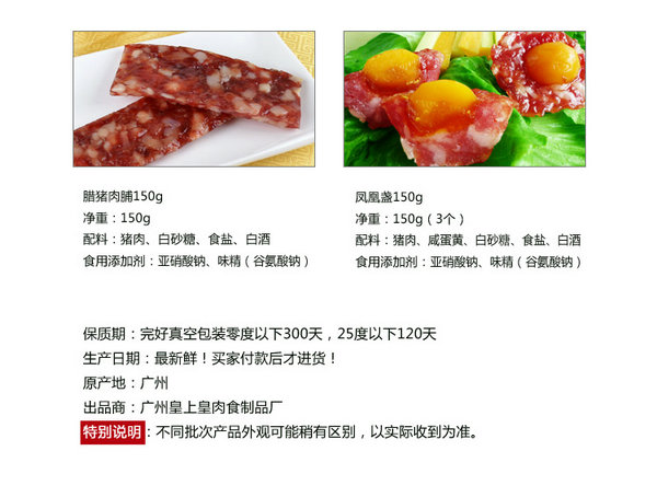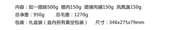 内容物:500克如一腊肠,150克腊肉,150克腊猪肉片,150克凤黄盏