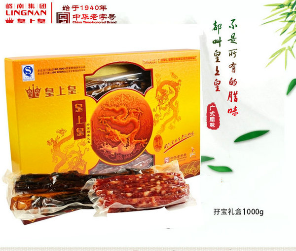 出品商:广州皇上皇集团有限公司是广州岭南国际企业集团有限公司旗下的全资国有企业,是一家集食品加工、冷藏储存、肉品贸易、屠宰加工及鲜肉销售的大型国有企业集团。皇上皇具有悠久的历久,是中国腊味、肉制品行业龙头企业,国家腊味标准主要定制单位,引领着中国腊味、肉制品行业发展新方向。皇上皇,中华老字号,始于1940年,素有腊味之王的美誉,其总店位于上下九步行街。上下九为广州必去地方,皇上皇腊肠也是必带手信之一,皇上皇腊味成为深受广大消费者的喜爱的送礼佳品,是誉满全国的广东特产,有华人的地方就有皇上皇,逢年过节必可以看到皇上皇总店排队购买的情形。