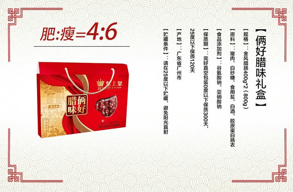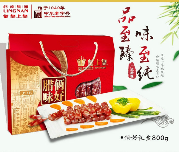 出品商:广州皇上皇集团有限公司是广州岭南国际企业集团有限公司旗下的全资国有企业,是一家集食品加工、冷藏储存、肉品贸易、屠宰加工及鲜肉销售的大型国有企业集团。皇上皇具有悠久的历久,是中国腊味、肉制品行业龙头企业,国家腊味标准主要定制单位,引领着中国腊味、肉制品行业发展新方向。皇上皇,中华老字号,始于1940年,素有腊味之王的美誉,其总店位于上下九步行街。上下九为广州必去地方,皇上皇腊肠也是必带手信之一,皇上皇腊味成为深受广大消费者的喜爱的送礼佳品,是誉满全国的广东特产,有华人的地方就有皇上皇,逢年过节必可以看到皇上皇总店排队购买的情形。