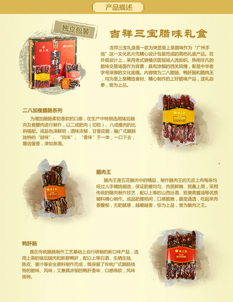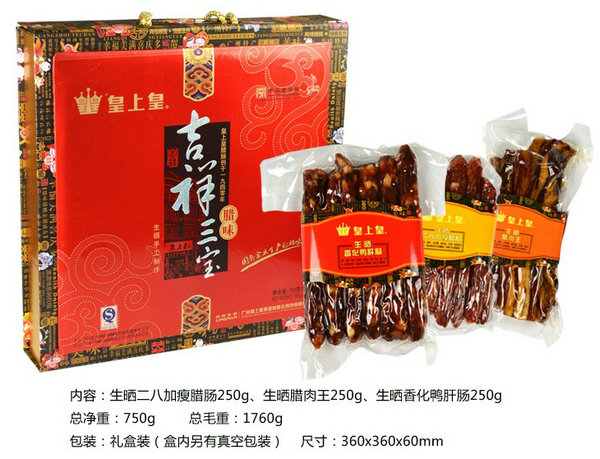 出品商:广州皇上皇集团有限公司是广州岭南国际企业集团有限公司旗下的全资国有企业,是一家集食品加工、冷藏储存、肉品贸易、屠宰加工及鲜肉销售的大型国有企业集团。皇上皇具有悠久的历久,是中国腊味、肉制品行业龙头企业,国家腊味标准主要定制单位,引领着中国腊味、肉制品行业发展新方向。皇上皇,中华老字号,始于1940年,素有腊味之王的美誉,其总店位于上下九步行街。上下九为广州必去地方,皇上皇腊肠也是必带手信之一,皇上皇腊味成为深受广大消费者的喜爱的送礼佳品,是誉满全国的广东特产,有华人的地方就有皇上皇,逢年过节必可以看到皇上皇总店排队购买的情形。