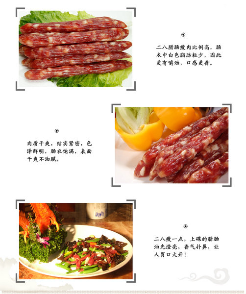 特 色: 采用传统腊味制作工艺,精选最佳上好无皮放心上肉,配上山西汾酒,肥瘦2:8,特级腊肠,口感醇厚,酒香味浓郁。