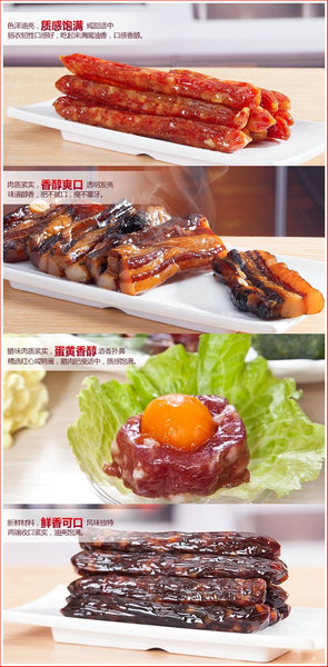 内容物:腊肉100克*1袋;美味腊肠150克*1袋;鸭润腊肠150克*1袋;蛋黄100克*1袋。