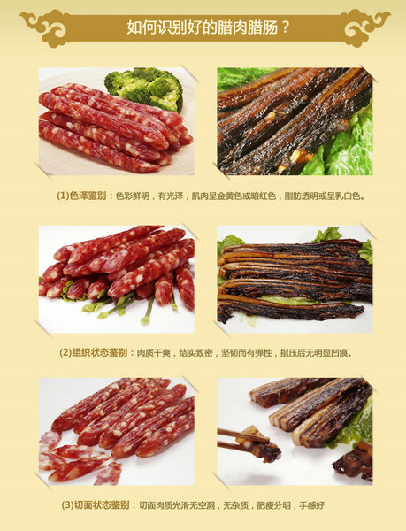 【产品配料】:猪肉、白砂糖、食盐、白酒、味精、胶原蛋白肠衣、酱油(腊肉)