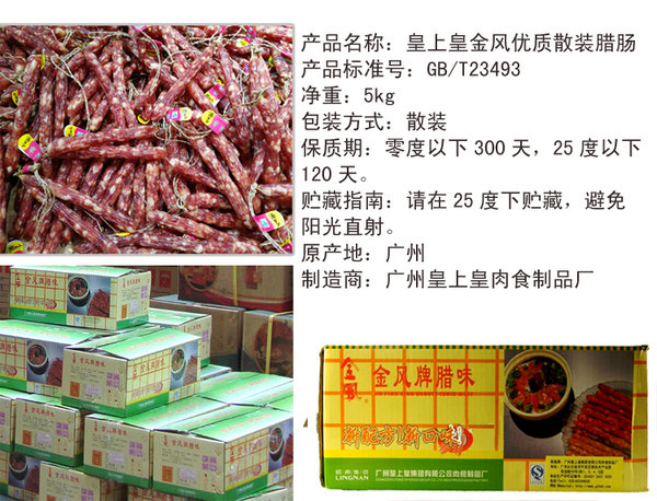 出品商:广州皇上皇集团有限公司是广州岭南国际企业集团有限公司旗下的全资国有企业,是一家集食品加工、冷藏储存、肉品贸易、屠宰加工及鲜肉销售的大型国有企业集团。皇上皇具有悠久的历久,是中国腊味、肉制品行业龙头企业,国家腊味标准主要定制单位,引领着中国腊味、肉制品行业发展新方向。皇上皇,中华老字号,始于1940年,素有腊味之王的美誉,其总店位于上下九步行街。上下九为广州必去地方,皇上皇腊肠也是必带手信之一,皇上皇腊味成为深受广大消费者的喜爱的送礼佳品,是誉满全国的广东特产,有华人的地方就有皇上皇,逢年过节必可以看到皇上皇总店排队购买的情形。 我司是广州皇上皇集团有限公司授权的大型实体经销商,专业从事皇上皇系列食品的经销批发和大型超市的供应业务及为广大企事业单位提供团购业务。我们所售的皇上皇系列产品均为厂家直供的正品,敬请广大客户放心订购。如有担心货品真伪的客户可到皇上皇专卖店提货,欢迎广大客户前来咨询、订购!量大价格更优惠并可开具增值税专用发票及进公帐,免费送货,货到付款等! 广州及珠三角地区免费送货,货到付款!