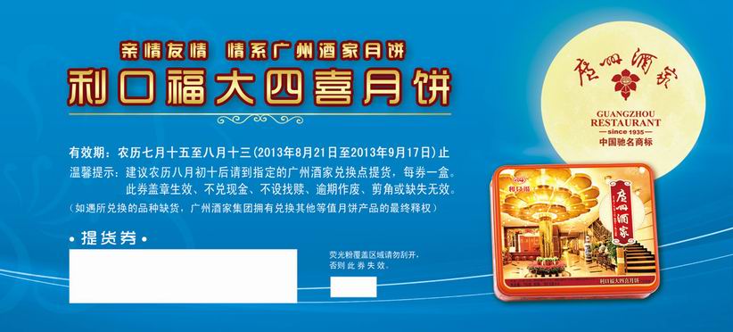 广州酒家利口福大四喜月饼提货券(月饼券)