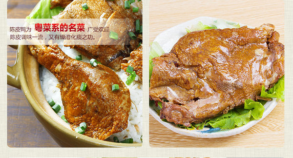 特 色:本品精选用经陈年陈皮配家鸭用传统烹调与现代工艺相结合,使其肉绵滑、味浓香、骨更入味。陈皮鸭为粤菜系的名菜广受欢迎。陈皮调味一流,又有燥湿化痰之功效。