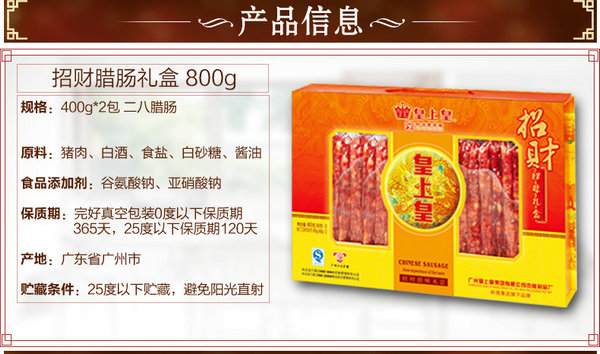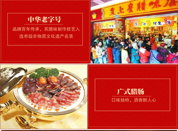 出品商:广州皇上皇集团有限公司是广州岭南国际企业集团有限公司旗下的全资国有企业,是一家集食品加工、冷藏储存、肉品贸易、屠宰加工及鲜肉销售的大型国有企业集团。皇上皇具有悠久的历久,是中国腊味、肉制品行业龙头企业,国家腊味标准主要定制单位,引领着中国腊味、肉制品行业发展新方向。皇上皇,中华老字号,始于1940年,素有腊味之王的美誉,其总店位于上下九步行街。上下九为广州必去地方,皇上皇腊肠也是必带手信之一,皇上皇腊味成为深受广大消费者的喜爱的送礼佳品,是誉满全国的广东特产,有华人的地方就有皇上皇,逢年过节必可以看到皇上皇总店排队购买的情形。