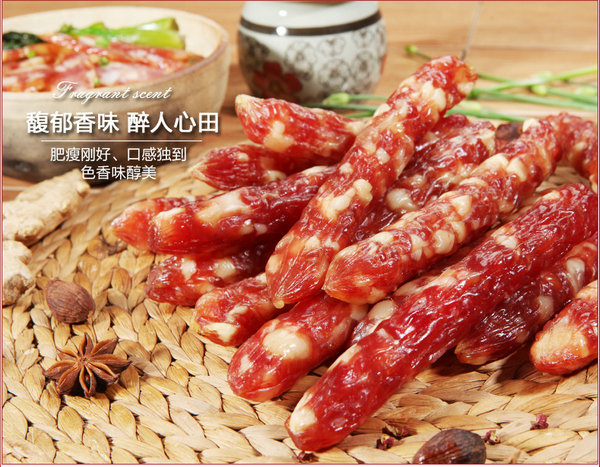 【产品配料】:猪肉、白砂糖、食盐、白酒、味精、胶原蛋白肠衣、酱油(腊肉)