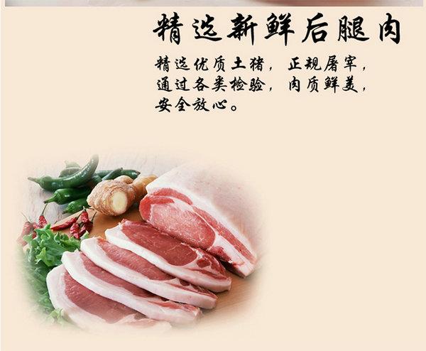 特 色: 采用传统腊味制作工艺,精选最佳上好无皮放心上肉,配上山西汾酒,肥瘦2:8,特级腊肠,口感醇厚,酒香味浓郁。