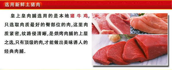 特 色: 采用皇上皇传统腊味制作技艺,精选最佳上好放养放心猪肉,富含人体所需的各种氨基酸,肉质鲜嫩可口,营养价值高。具有独特的“豉味”“风味”“香味”,口感醇厚,晶莹通透,香味浓郁。