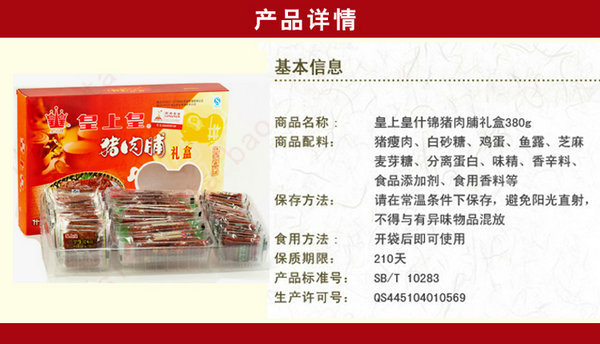 出品商:广州皇上皇集团有限公司是广州岭南国际企业集团有限公司旗下的全资国有企业,是一家集食品加工、冷藏储存、肉品贸易、屠宰加工及鲜肉销售的大型国有企业集团。皇上皇具有悠久的历久,是中国腊味、肉制品行业龙头企业,国家腊味标准主要定制单位,引领着中国腊味、肉制品行业发展新方向。皇上皇,中华老字号,始于1940年,素有腊味之王的美誉,其总店位于上下九步行街。上下九为广州必去地方,皇上皇腊肠也是必带手信之一,皇上皇腊味成为深受广大消费者的喜爱的送礼佳品,是誉满全国的广东特产,有华人的地方就有皇上皇,逢年过节必可以看到皇上皇总店排队购买的情形。